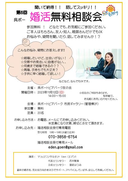 広島・呉市の呉ポーにオフィスのある結婚相談所(婚活サイト)、マリッジコンサルタント Edenです。『成婚第一主義』の弊社では、これまでの実績と多くの仲人経験を積んだ優秀なカウンセラー親切丁寧なサービスを心がけ、どなたも“迷いのない活動”ができる“充実のリーズナブル&ワンプラン料金”を実現しました。 無料婚活力診断でおすすめの婚活スタイルをゲットしてください。