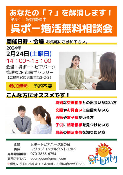 広島・呉市の呉ポーにオフィスのある結婚相談所(婚活サイト)、マリッジコンサルタント Edenです。『成婚第一主義』の弊社では、これまでの実績と多くの仲人経験を積んだ優秀なカウンセラー親切丁寧なサービスを心がけ、どなたも“迷いのない活動”ができる“充実のリーズナブル&ワンプラン料金”を実現しました。 無料婚活力診断でおすすめの婚活スタイルをゲットしてください。