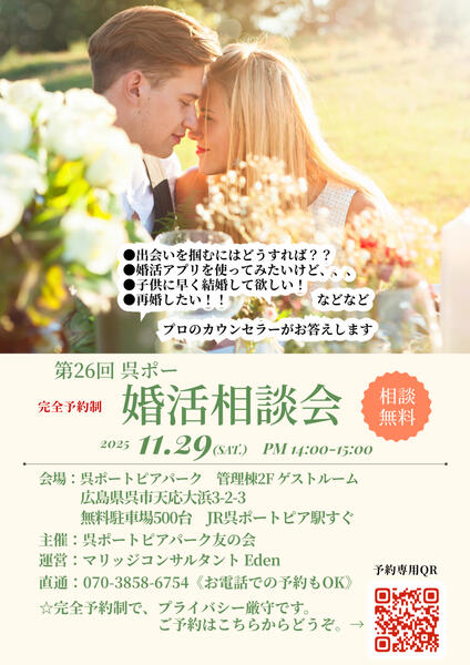 広島・呉市の呉ポーにオフィスのある結婚相談所(婚活サイト)、マリッジコンサルタント Edenです。『成婚第一主義』の弊社では、これまでの実績と多くの仲人経験を積んだ優秀なカウンセラー親切丁寧なサービスを心がけ、どなたも“迷いのない活動”ができる“充実のリーズナブル&ワンプラン料金”を実現しました。 無料婚活力診断でおすすめの婚活スタイルをゲットしてください。
