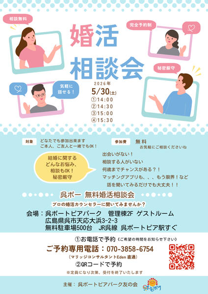 広島・呉市の呉ポーにオフィスのある結婚相談所(婚活サイト)、マリッジコンサルタント Edenです。『成婚第一主義』の弊社では、これまでの実績と多くの仲人経験を積んだ優秀なカウンセラー親切丁寧なサービスを心がけ、どなたも“迷いのない活動”ができる“充実のリーズナブル&ワンプラン料金”を実現しました。 無料婚活力診断でおすすめの婚活スタイルをゲットしてください。